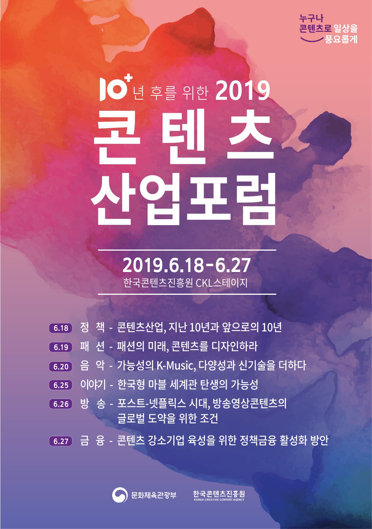 문화체육관광부(장관 박양우, 이하 문체부)와 한국콘텐츠진흥원(원장 김영준, 이하 콘진원)은 콘텐츠산업의 지난 10년을 돌아보고 앞으로 10년간 지속가능한 성장을 위한 발전 방안을 모색하는 ‘2019 콘텐츠산업포럼’을 오는 18일부터 20일까지, 25일부터 27일까지 총 6일간 서울 광화문 CKL스테이지에서 개최한다.
