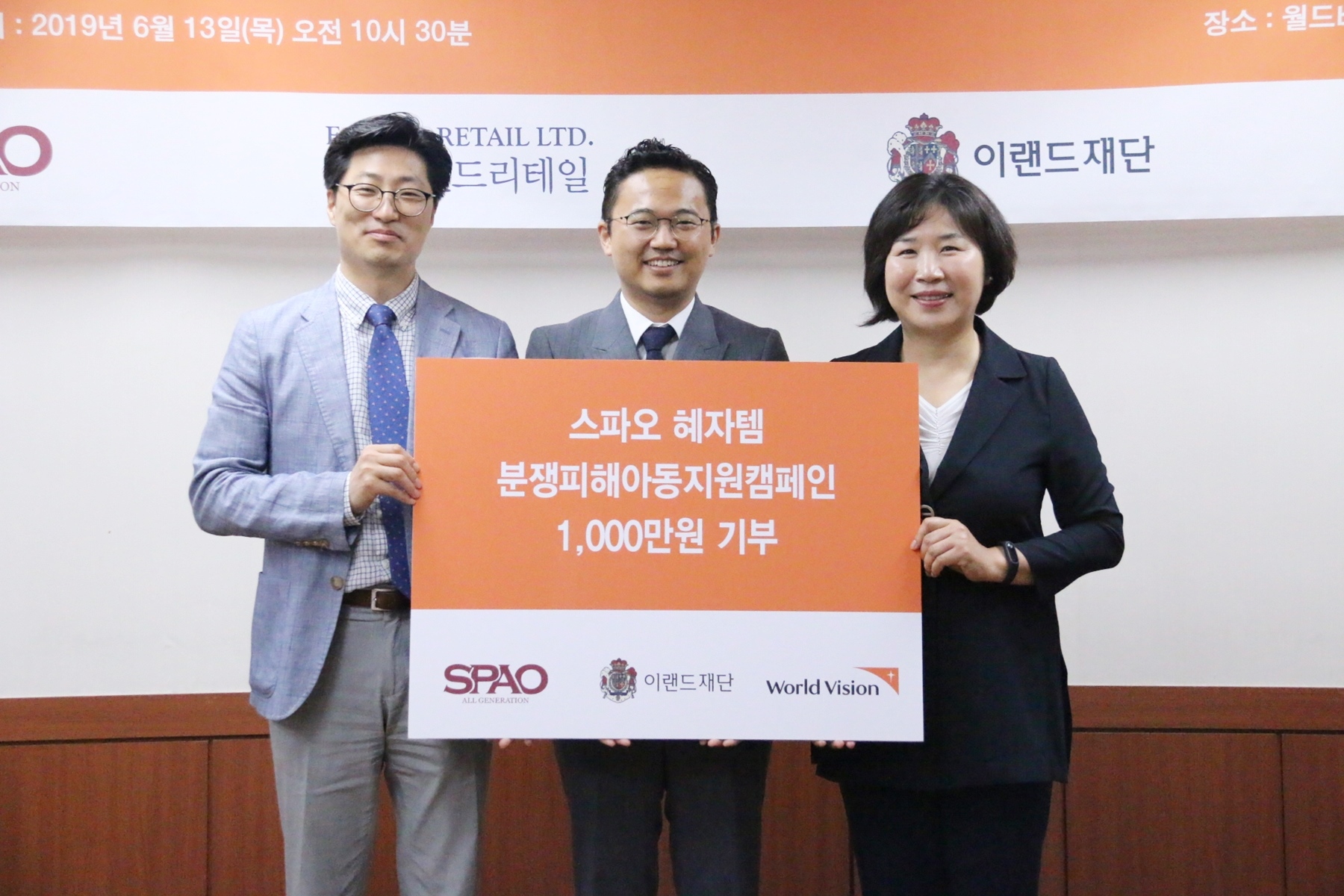 이랜드재단은 지난 13일 서울시 영등포구에 위치한 월드비전 9층 홍보관에서 이랜드월드 원종관 스파오 본부장과 이랜드리테일 정자성 하이퍼 본부장이 참석한 가운데 월드비전에 2천만원의 기부금을 전달하는 기증식을 진행했다.