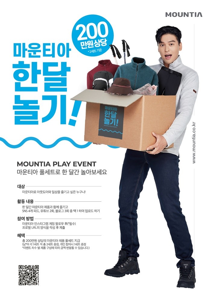 선발된 참가자들은 한 달 내로 마운티아 제품을 입고 활동한 자신의 모습을 개인 SNS 피드에 필수 해시태그와 함께 4회 공유하면 된다. 유튜브 2회 업로드 또는 블로그 3회 포스팅으로 대체할 수 있으며 우수 콘텐츠 작성자에 선정된 ‘마운티아 놀기왕’ 1인은 리조트 숙박권이 증정된다.