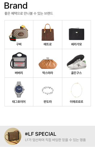 구찌, 프라다, 페라가모, 버버리 등 약 30만개의 명품 브랜드가 참여한 LF몰의 명품대전은 할인 대상 상품을 최대 30만개로 선보였으며 전 상품 10% 플러스 쿠폰을 증정해 다양한 아이템들을 합리적인 가격에 구매 가능하다.