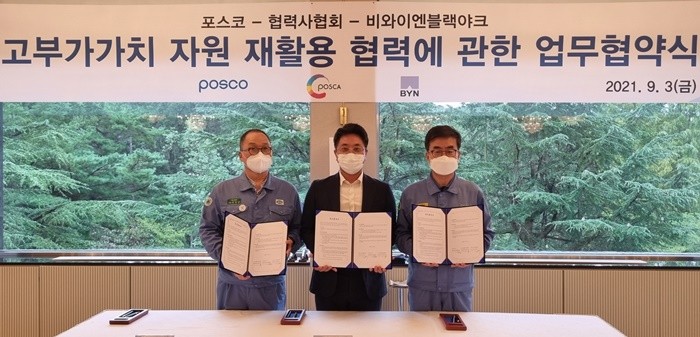 비와이엔블랙야크와 포스코 포항제철소, 포스코 포항제철소 협력사협회가 3일 오전 경상북도 포항시에 위치한 포스코 포항제철소에서 투명 페트병을 활용해 친환경 제품을 생산하는 재활용 활성화 업무 협약을 체결했다. 왼쪽부터 포스코 포항제철소 한형철 행정부소장, 비와이엔블랙야크 김정회 상무, 포스코 포항제철소 협력사협회 김헌덕 회장.