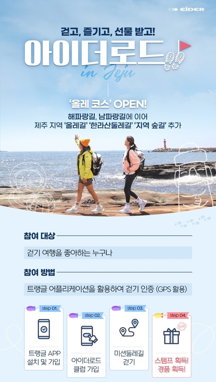 아웃도어 브랜드 ‘아이더’가 코리아둘레길을 따라 걸으며 즐기는 ‘아이더로드 캠페인’의 코스를 제주도까지 확장 전개한다. 새롭게 추가된 제주 지역 ‘아이더로드 올레’ 코스는 올레길 전구간(27코스), 한라산 둘레길 전구간(8코스), 한라산 정상, 지역 숲길(머체왓 숲길, 고살리 숲길, 마흐니 숲길, 수월봉트레일, 서귀포 치유의숲, 화순곶자왈생태탐방숲길, 산양곶자왈)이다.