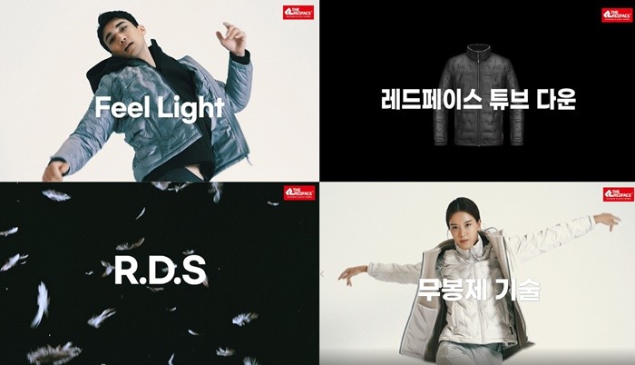 이뿐만 아니라 일반 봉제와 달리 하이테크 제직기술의 심리스(무봉제) 공법으로 다운 누출을 최소화하고 보온성을 극대화시킨 이엑스 튜브 라이트 소재의 뛰어난 방풍성 및 우수한 통기성을 모델들의 다양한 포즈와 표정 등을 통해 표현해 기대감을 높였다.