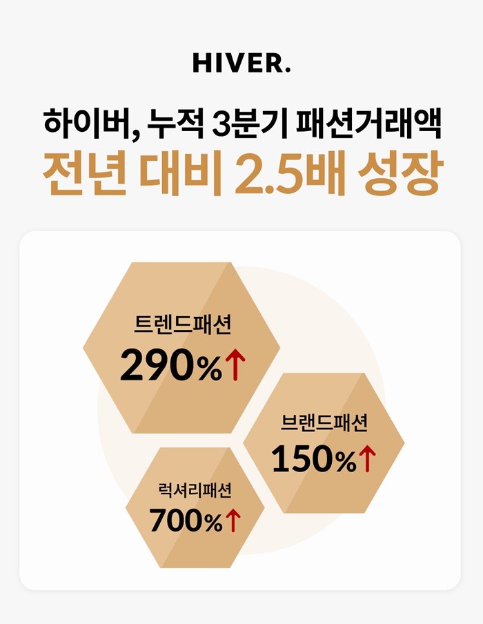 하이버에서는 가성비 패션부터 명품 패션까지 두루 활용하는 MZ세대의 취향이 엿보인다. 올해 1~3분기까지의 거래액을 분석해보면 브랜드와 비브랜드 부문이 모두 성장했는데, 거래액 기준으로는 트렌드 패션, 브랜드 패션, 럭셔리 패션순으로 비중이 높았다. 트렌드 패션은 올해 3분기(1~9월)까지의 거래액이 지난해 동기 대비 290% 수준으로 성장하면서 견조한 성장세를 이어갔으며 품질 좋은 가성비 패션에 대한 선호도를 확인했다.