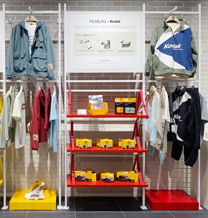 코닥어패럴 X 필름로그 협업은 코닥어패럴 매장 내에 필름 현상서비스를 의뢰하는 필름로그 무인 접수함 운영 형태로 이루어진다. 아날로그 감성에 빠진 2030 세대 사이에서 필름카메라 이용자 수가 증가하고 있음을 고려해, MZ(밀레니얼+Z)세대 공략 강화를 위해 기획한 매장운영 전략이다. 그 동안 백화점 3곳 (현대 천호, 롯데 동탄, 롯데 평촌)에 한정해 선보였다.