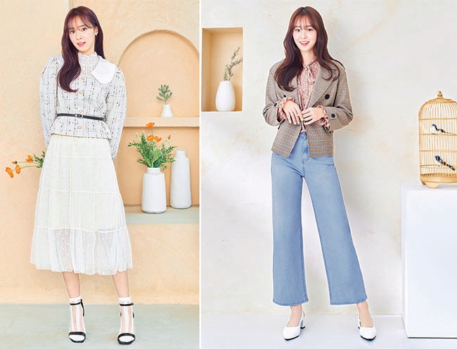 또한 봄간절기룩의 정석인 데일리 자켓 스타일링을 선보였다. 차분한 느낌이 감도는 체크패턴의 크롭 자켓과 리본 디테일이 사랑스러운 느낌을 자아내는 블라우스를 매치하여 데일리 스타일링에서도 무자크만의 감성을 보여주었다.