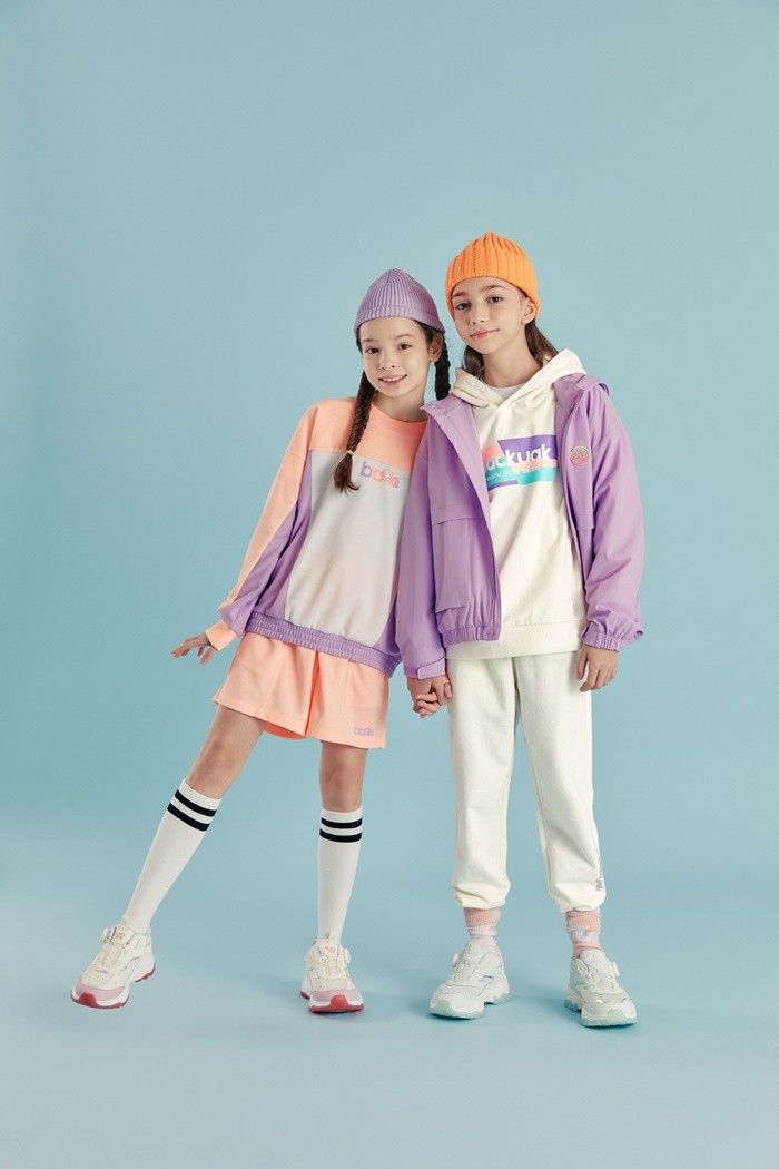 먼저, 오버핏으로 캐주얼한 스타일링을 살리기 좋은 ‘BK티니OV후드티셔츠’와 ‘BK티니팬츠’ 셋업이 있다. 후드티셔츠의 가슴 부분에 파스텔톤의 그래픽 포인트로 화사함을 더했으며, 면과 폴리에스터 혼방 소재로 부드러운 착용감을 선사한다. 손ㆍ발목 시보리로 움직임이 많은 아이들의 편의성을 높였다. 여아용으로 크림과 민트 컬러 2종으로 출시됐다.