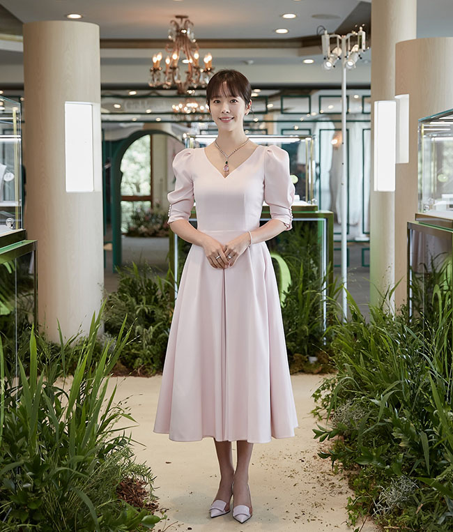 퍼프 소매의 화이트 드레스를 입은 화보속 한지민은 모던하고 클래식한 디자인의 ‘듀 이터널스(Dew Eternals) 제품을 착용해 우아한 매력을 발산하며 움직이는 각도에 따라 다채로운 광택으로 신비함을 더했다.