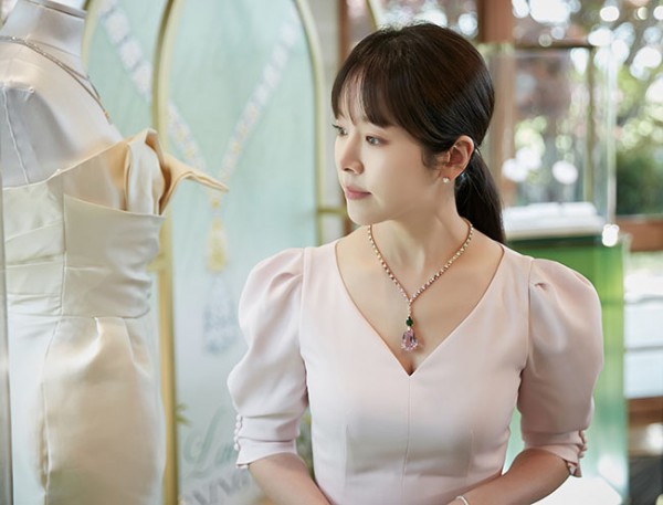 한지민이 착용한 ‘컬러 오브 듀 목걸이’는 반짝이는 이슬방울을 모티브로 화사한 46.94캐럿 쿤자이트에 차보라이트, 다이아몬드, 무지개색 팬시 사파이어가 어우러져 보석의 다채로운 색채가 돋보이는 매혹적인 목걸이로 꽃이 가득한 봄의 숲을 옮겨 온 듯한 아름다움을 선사한다.