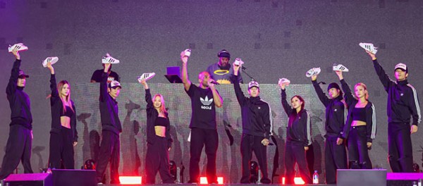 아디다스 글로벌 파트너로 활동 중인 런 디엠씨(Run D.M.C.)와 파트너로 활동 중인 가수 박재범(왼쪽에서 6번째)이 힙합 탄생 50주년 기념 공연에서 아디다스 ‘슈퍼스타’ 스니커즈를 들어 보이고 있다.