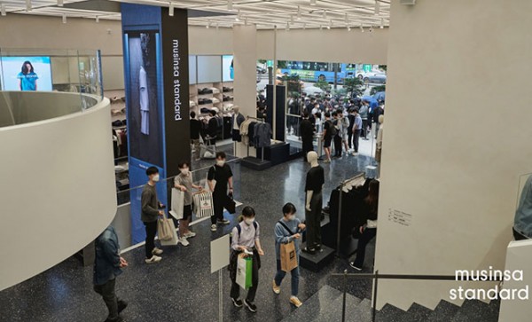 무신사가 전개하는 모던 베이식 캐주얼 패션 브랜드 ‘무신사 스탠다드(musinsa standard)’가 지난 5월 28일 홍대 인근에 첫 번째 플래그십 스토어 ‘무신사 스탠다 드 홍대’를 오픈했다. 주 이용 층인 10~20대 고객의 특 성을 고려해 오프라인 첫 진출지로 젊음의 거리 홍대를 선택한 것. 플래그십 스토어는 홍대 머큐어 앰배서더 호 텔 건물에 지하 1층부터 지상 2층 규모로 들어섰다. 영업 면적은 850㎡(약 250평)에 이른다.