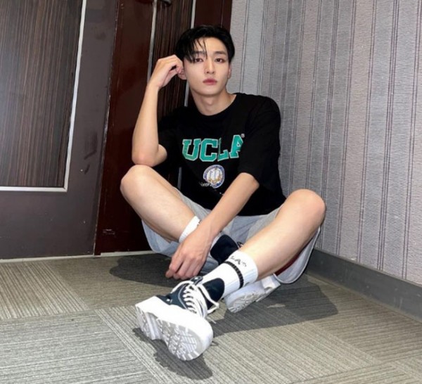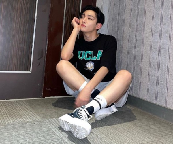 윤지성은 캐주얼하면서도 현실 남친의 매력이 느껴지는 오버핏의 레터링 티셔츠와 트레이닝 쇼츠를 입고 무심한듯 패셔너블한 스타일을 자랑했다. 그가 착용한 의상은 캐주얼 브랜드 UCLA의 제품으로 아플리케 로고가 포인트로 들어가 반팔 티셔츠는 윤지성만의 개성을 잘 살려준다.
