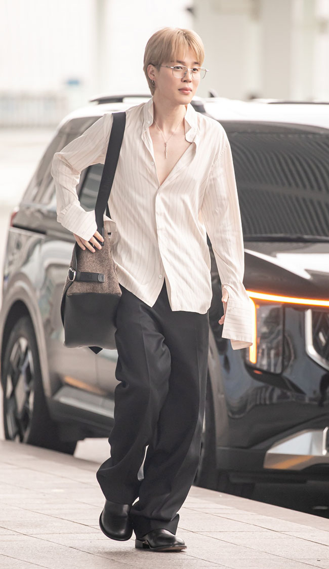 지민의 공항패션을 완성시켜 준 룩은 디올(Dior) 제품으로 알려졌다. Dior Summer 26 컬렉션 핑크 스트라이프 트윌 셔츠로 컬러감에 포인트를 주면서, 블랙 첼시 부츠와 브라운 울 메신저 백을 함께 매치해 클래식함을 더해주었다.