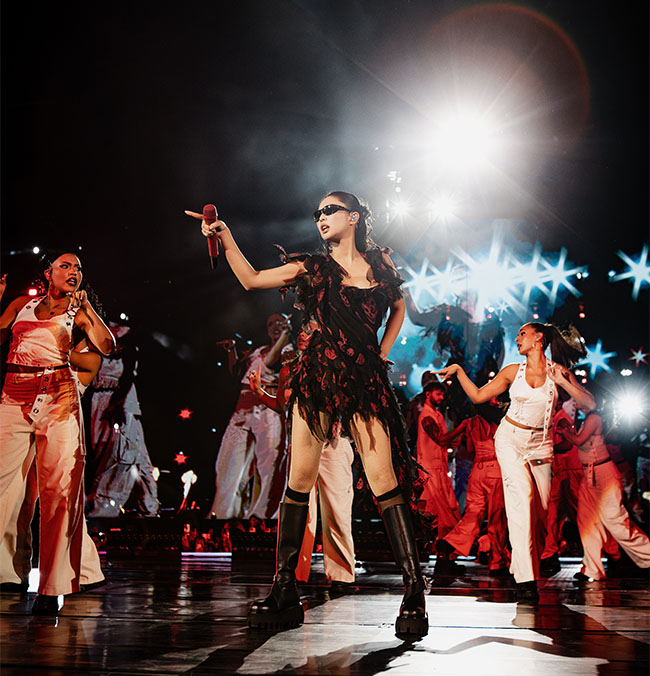 제니는 맥퀸 2026 봄/여름 프리 컬렉션의 커스텀 드레스를 착용해 강렬한 무대를 완성했다. 브랜드의 상징적인 스컬 프린트 실크 시폰 드레스에 크리스털 자수 장식을 더해 화려함을 배가했으며, 여기에 맥퀸의 랩어라운드 벨티드 재킷과 맥퀸 소파 니하이 부츠를 매치해 완벽한 룩을 선보였다.