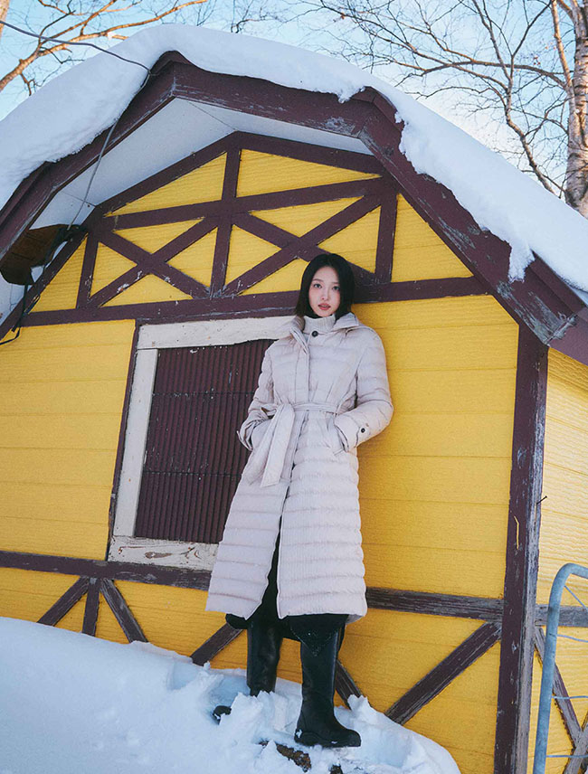 표예진은 눈 덮인 삿포로를 배경으로 허리를 자연스럽게 조여주는 벨티드 디자인의 구스 롱 다운에 플리츠 탑, A라인 플리츠 스커트를 매치해 엘레강스한 무드의 겨울 스타일링을 완성했다. 플리츠웨어 특유의 텍스처와 구조적인 실루엣이 조화를 이루는 착장에 특유의 분위기가 더해져 경쾌하면서도 품격 있는 겨울 분위기를 연출했다.