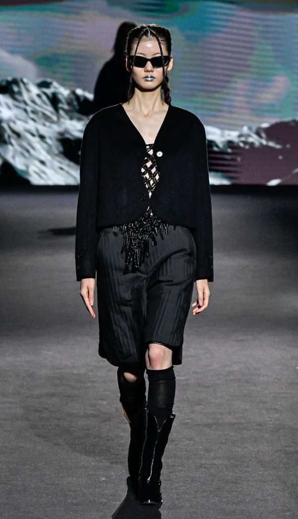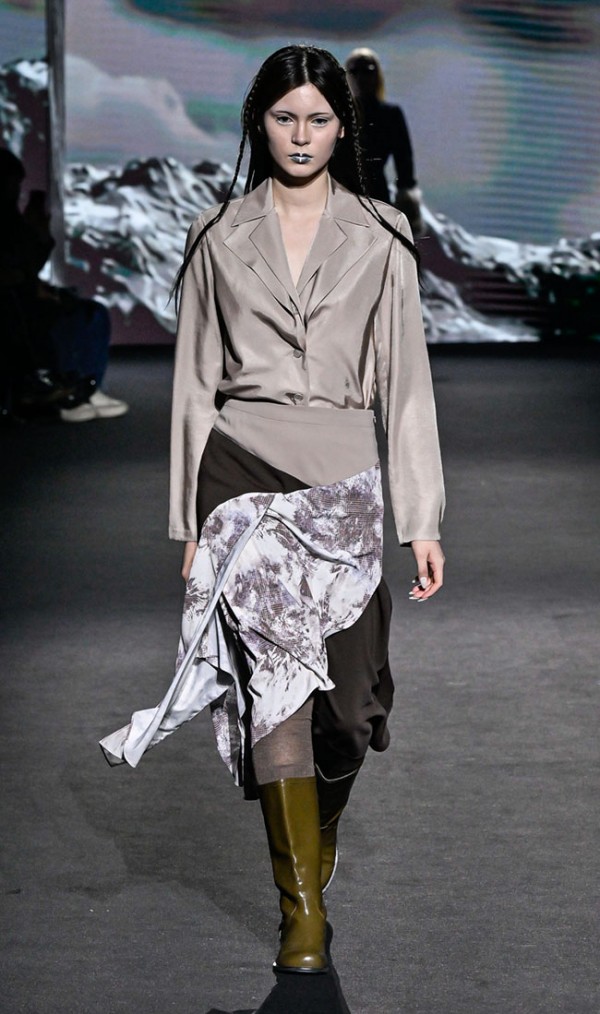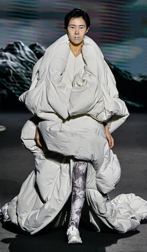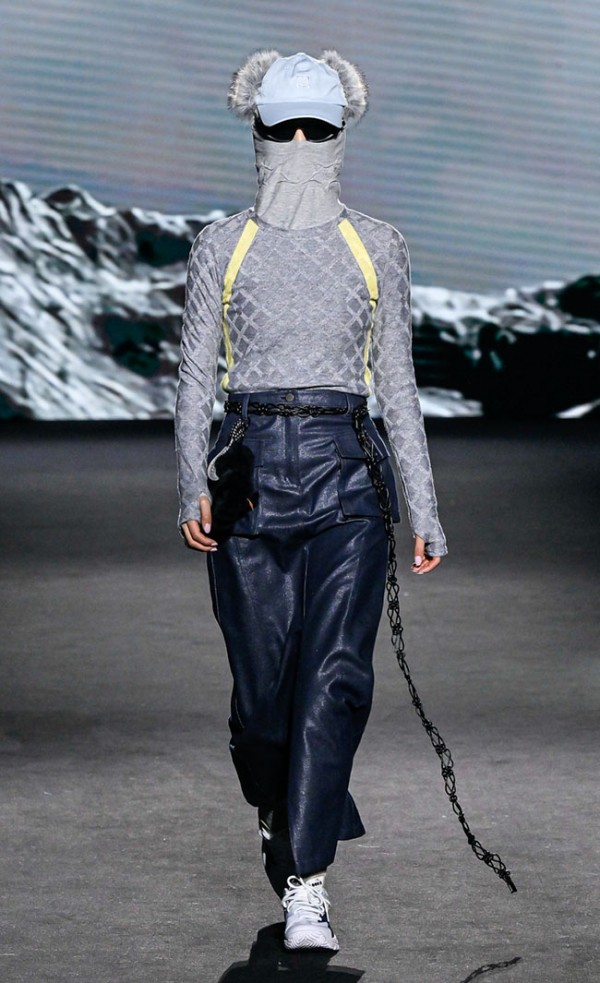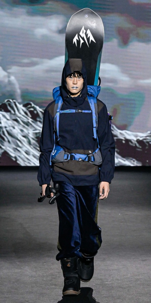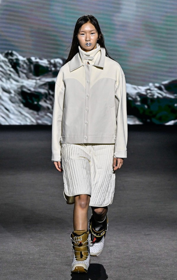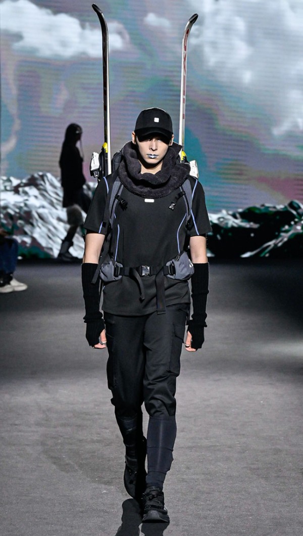 Rooted in ready-to-wear, the designs feature meticulously engineered pattern lines that combine dynamic curves, evoking wind-cutting motion, with sharp linear seam details that symbolize speed. Slim, ski-suit–inspired layering is balanced with structurally voluminous outerwear, creating a harmonious interplay between form and function.