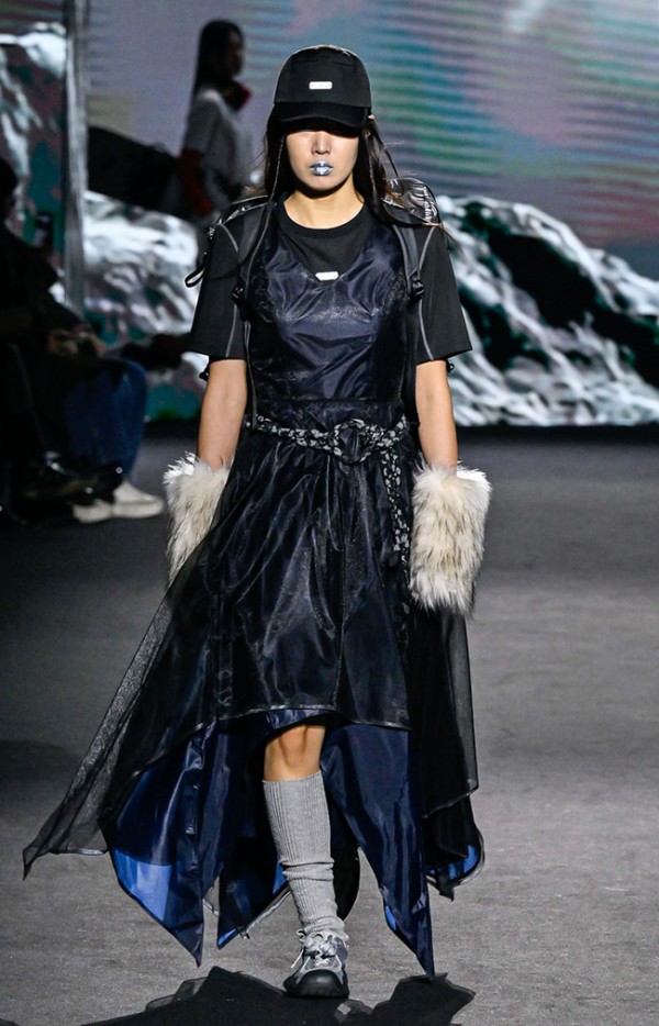 레디투웨어를 기반으로 하여 바람을 가르는 다이내믹 곡선과 속도를 상징하는 직선적인 절개 디테일이 가미된 정교한 패턴 라인으로 구성되며, 스키 수트를 연상시키는 슬림 레이어링과 구조적 볼륨 아우터가 조화와 균형을 이룬다.