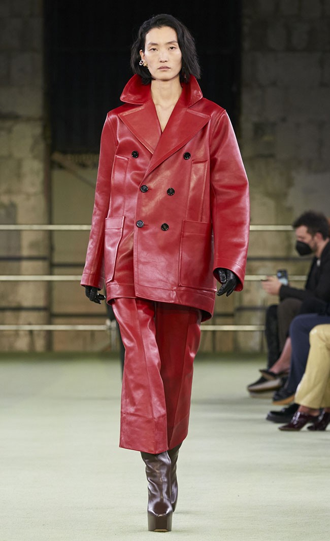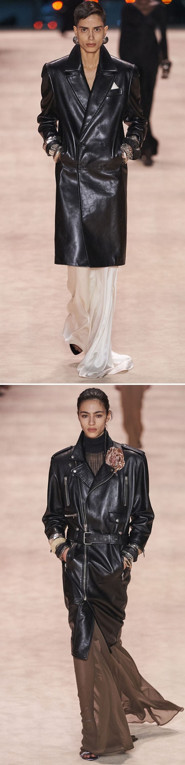 유연하게 업데이트 된 가죽은 아우터 뿐 아니라, 드레스, 팬츠, 셔츠 등 다양한 아이템에 활용되고, 광택감 있는 표면의 가죽소재는 파티웨어 강세와 맞물려 더욱 활용도가 높아졌다.