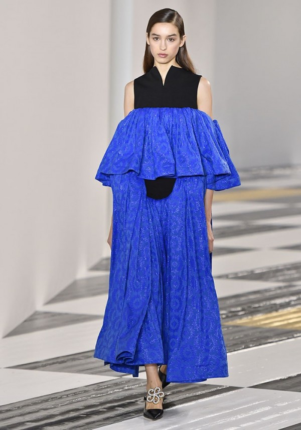 기하학적인 빕 프론트와 볼륨있는 힙, 단단한 세라믹 브레스트 플레이트와 드레이핑의 대조로 표현됐다. 볼륨의 경우 드레이핑을 통해 형성되거나 움직임에 반응하도록 제안됐다. 더 나아가 움직임에 보다 극적으로 반응하는 요소들이 첨가되며 실루엣을 보다 흥미롭게 연출했다. 숄더에 매달린 듯한 케이프 슬리브, 티어드 슬리브, 과장된 사이즈의 러플과 보우, 행커치프 헴과 플레어드 헴, 의상의 여유분을 통해 형성된 폴딩 디테일 등이 대표적이다.
