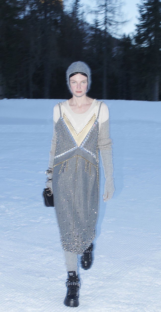 팬데믹 이후에 가고 싶을 것 같은 이탈리아의 눈 덮인 돌로미티(Dolomites) 산에서 쇼를 진행했다. 보호적으로 남아있고 싶은 심리와 드레스-업해서 나가고 싶은 심리를 동시에 담고 있다. 액티브 아웃도어를 상징하는 스키웨어와 인도어를 상징하는 란제리 드레싱, 니팅과 같은 소박한 크래프트와 펑크적인 장식의 대조. 아우터와 드레스에 집중했다.