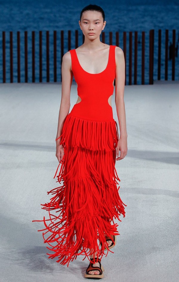 수공예를 그래픽적이고 컬트적으로 표현. 특히 프린지가 강조. 저지 코드, 비즈, 로엣지를 활용하여 다채롭게 표현. 웨이스트에 적용된 크로쉐 패널과 컷아웃에 적용된 루시드 파이핑