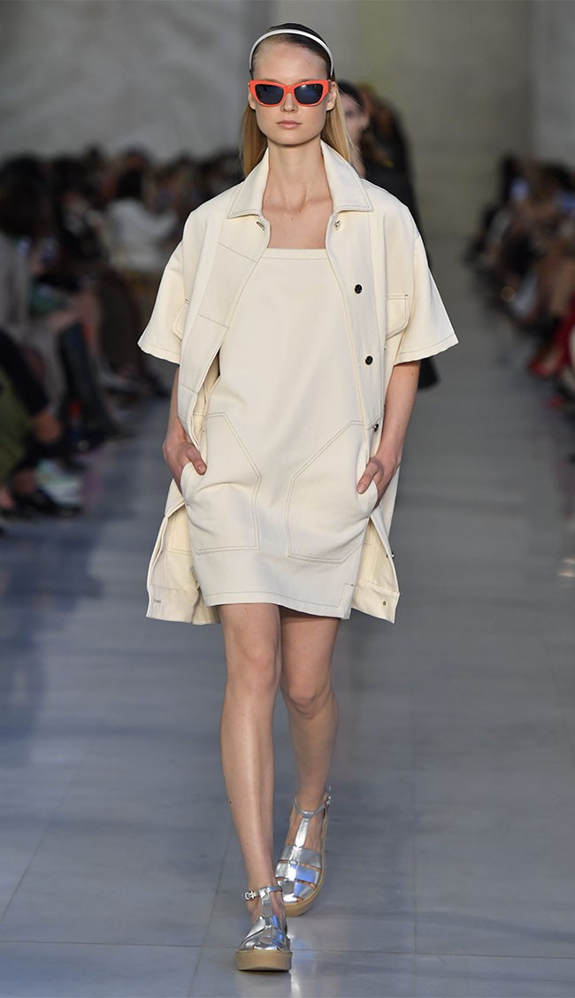 수트와 세트가 중심을 이루는데 전형적인 테일러드 스타일은 배제하고 유틸리티적인 워크웨어에 테일러링을 결합하는 방식으로 표현했으며 직선적이고 구조적인 실루엣이 강조되는데 유연도가 다른 소재를 적용하여 뉘앙스의 변화를 유도하고 미니 기장, 탱크 톱, 밴도우을 활용하여 젊고 경쾌하게 표현했다.