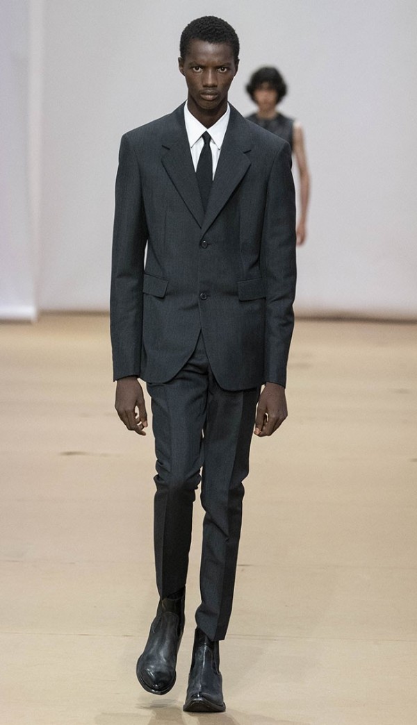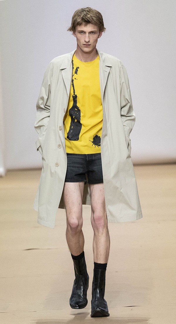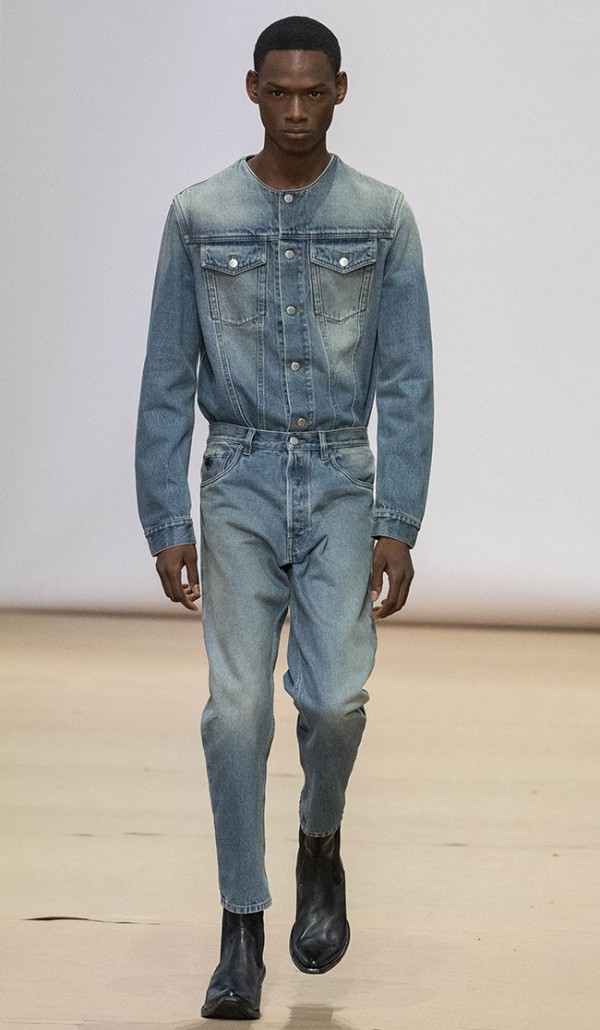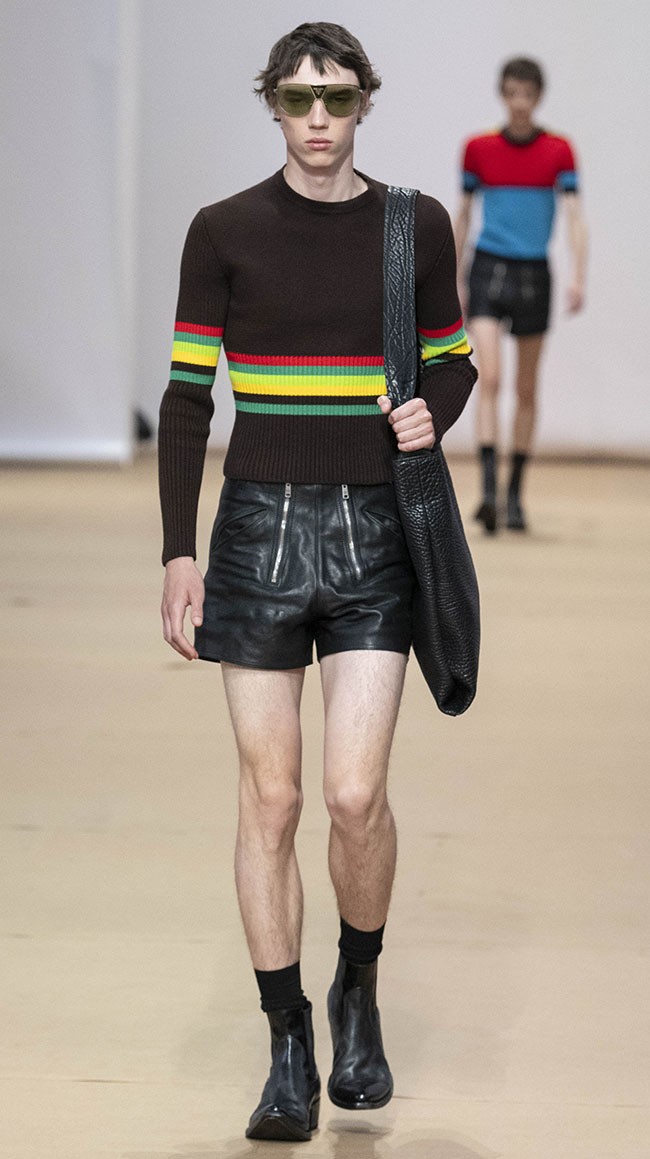 수트, 오버코트, 스웨터, 셔츠, 데님, 가죽이 키 룩. 데님 및 가죽으로 구성된 짧은 기장의 숏 팬츠를 중점적으로 선보임.