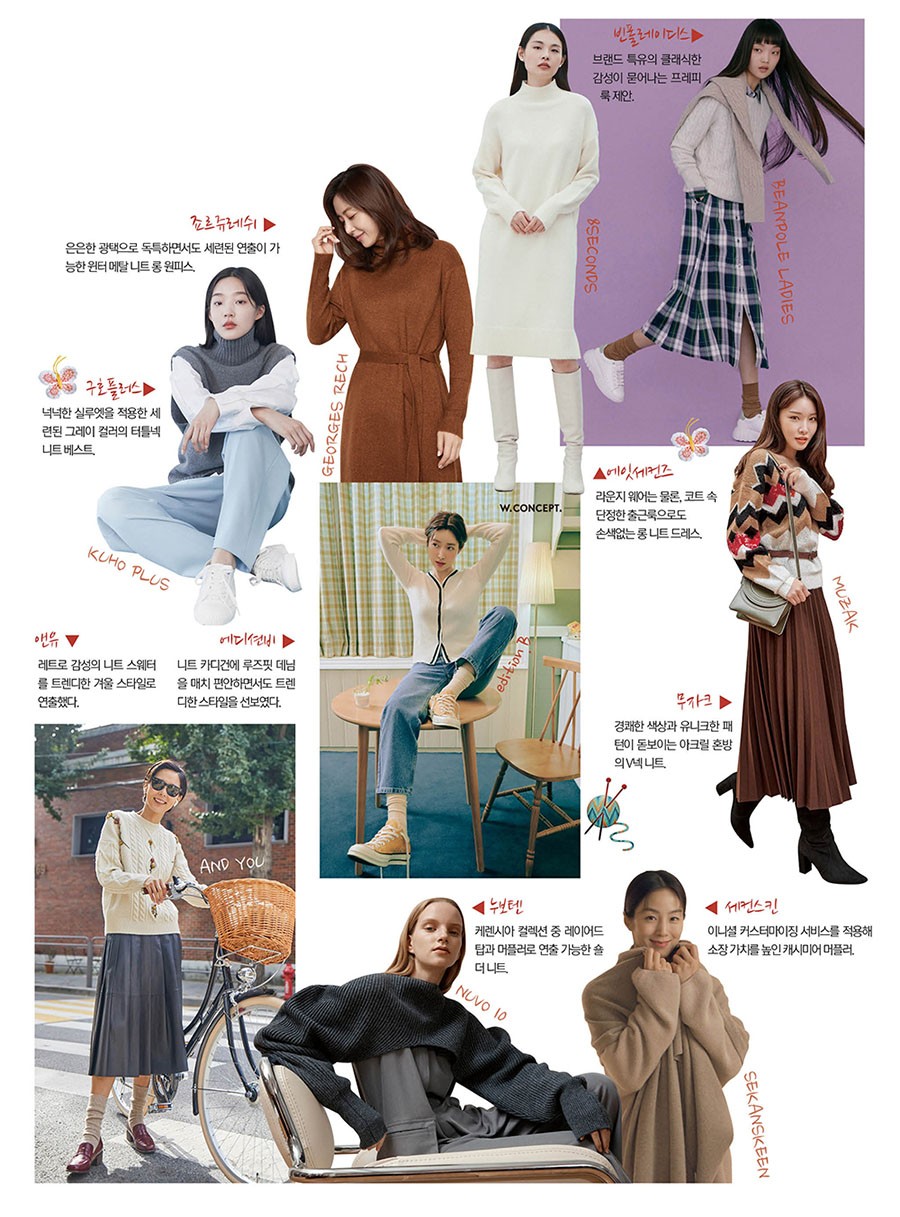 정교하게 짜인 니트는 신축성이 뛰어나 편안하고, 다양한 네크라인의 스웨터, 원피스, 베스트, 카디건 또는 머플러, 모자 등 여러 아이템으로 연출할 수 있다.