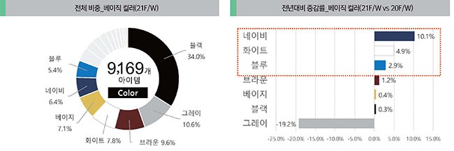 전체 비중에서는 블랙, 그레이 등의 시즌리스한 베이직 컬러의 비중이 압도적으로 높지만, 전년대비 증감률을 보면 네이비(+10.1%), 화이트(4.9%), 블루(2.9%)의 증가세가 눈에 띈다. 캐주얼한 스타일이 강세를 보이면서, 데님류의 네이비와 블루가 스타일 전반에 걸쳐 다양하 게 활용된다. 지난 Pre-fall 시즌부터 헤드투토 화이트 스타일링들이 트렌드로 떠오르며, 컬러에서도 화이트(+4.9%)가 전년대비 비교적 높은 증가세를 나타냈다.