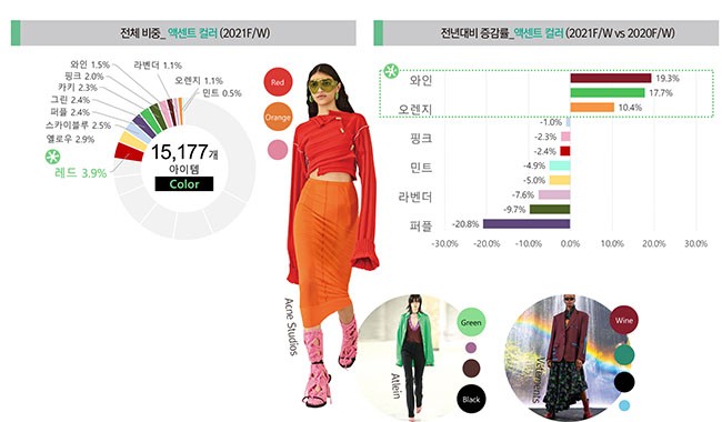 전년대비 와인(+19.3%), 그린(+17.7%), 오렌지(+10.4%) 컬러가 증가세를 보였으며, 무난한 베이직 컬러와의 레이어링을 통해 산뜻하고 개성있는 룩을 연출한다.