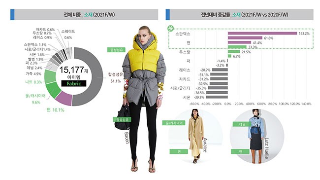 합성섬유를 제외하고, 면(10.1%), 니트(8.3%) 소재가 전체에서 많은 비중을 차지했으며, 레깅스 및 운동복에 활용되는 스판덱스(+123.2%)와 함께 니트(+61.6%), 면(+41.4%), 데님(+33.3%)소재가 전년대비에서도 높은 증가세를 나타냈다.
