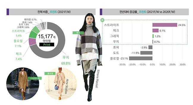 이번 시즌에는 무난하고 클래식한 스트라이프(+24.5%), 체크(+6.1%) 패턴들이 전년대비 증가세를 보였으며, 볼드한 사이즈와 리드미컬한 배치로 업데이트 되었다. 또한, 개성을 담은 프레피 감각의 그래픽 아트워크, 오래된 벽지와 가구 등에서 영감을 받은 빈티지한 플로럴 프린트도 주요 트렌드로 보여진다.(자료제공: 패션넷코리아닷컴)