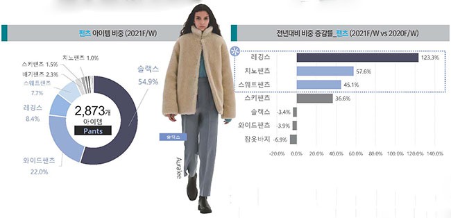 팬츠에서도 캐주얼한 스타일의 강세가 두드러진다. 팬츠아이템에서 노멀한 핏의 슬랙스(54.9%)와 와이드 핏 팬츠(22.0%) 가장 많은 비중을 차지하지만, 전년대비 비중 증감률에서는 레깅스(+123.3%), 치노팬츠(+57.6%), 스웨트팬츠(+45.1%) 등이 증가세를 보이며, 캐주얼하고 활동성이 편한 실용적인 스타일이 더욱 중요해지고 있음을 알 수 있다. 특히, 레깅스는 스포티한 스타일 뿐 아니라 일상복의 다양한 스타일에도 활용되어, 키아이템으로 떠올랐다.(자료제공: 패션넷코리아닷컴)