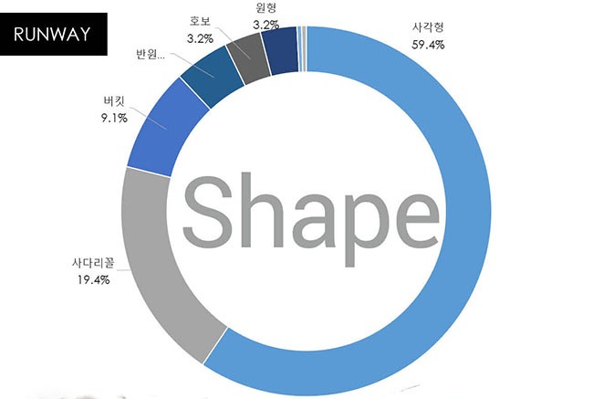 런웨이 BAG 이미지 중 사각형(59.4%)와 사다리꼴 (19.4%) 등 80%로 구조적 형태의 하드웨어와 동일 소재 스트랩, 탑핸들이 포함되고 변형된 독특한 Shape도 등장한다.