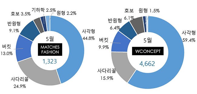 대표적인 글로벌 온라인 럭셔리 브랜드 리테일러인 matchesfashion과 국내 최대 온라인 편집숍인 Wconcept의 5월 한달 간 판매된 신상품 BAG 이미지 중 필터링을 거친 총 5,985개 이미지 분석 결과를 바탕으로 지금 가장 주목 받을 BAG Shape은 무엇인지 살펴보자.