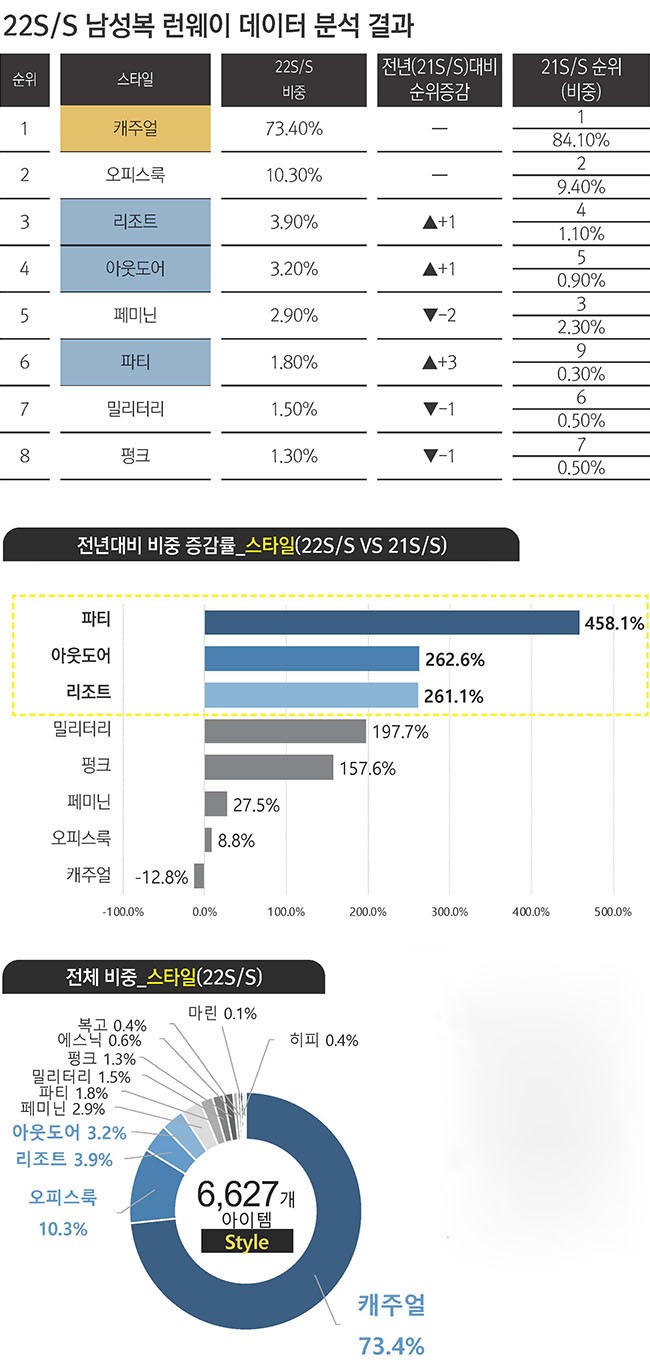 캐주얼 스타일은 73.4%로 남성복에서는 여전히 압도적인 비중을 차지하고 있으며, 편안함을 추구하는 경향이 지속되면서 캐주얼한 요소들이 스타일 전반에 다양하게 믹스매치 되고 있다. 그러나, 이번 시즌부터는 정상적인 생활로 복귀하는 사람들이 점점 늘어나면서 파티(+458.1%), 아웃도어(+262.6%), 리조트(+261.1%)등 다양한 활동을 위한 스타일들이 전년대비 더욱 증가하는 추세를 보이고 있다.