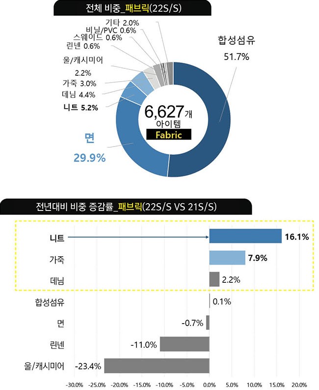실용성과 편안함을 추구하는 경향이 지속되면서, 패브릭에서는 합성섬유 및 면 소재가 지난 시즌에 이어 22S/S 시즌에도 높은 비중을 차지하는 것으로 나타났다. 또한, 이번 시즌에는 시즌리스한 경향으로, 니트, 가죽 등 F/W에 많이 활용되는 패브릭이 S/S 시즌에도 다양한 형태로 활용되면서, 전년대비 니트 (+16.1%)와 가죽(+7.9%)의 비중이 증가한 것이 특징이다.