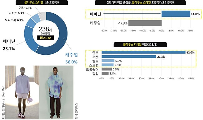 패션에서는 계속해서 젠더리스한 경향이 확대되고 있으며, 남성복에서는 셔츠와 함께 장식적인 디테일과 소프트한 패브릭을 활용한 블라우스 아이템도 다양하게 등장하며 주목받고 있다. 블라우스는 셔링 및 드레이프 디테일로 우아한 분위기를 연출한 페미닌(+14.8%) 스타일이 전년대비 비중이 증가하며, 강세를 보인다.