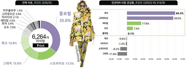 지난 시즌에는 팬데믹의 불안정한 경제 상황이 패션에 크게 영향을 미치면서 베이직 아이템에 밀려난 프린트&패턴 아이템들이 파티웨어 및 바캉스 아이템들이 트렌드로 떠오른 이번 시즌 다시 조금씩 활기를 띄기 시작했다. 여전히 프린트가 없는 무지 아이템들의 비중(65.3%)이 높지만, 브라이트한 컬러와 함께 시각적으로 화려하게 업데이트 된 패턴들이 핵심 트렌드로 주목받고 있다. 플로럴 및 스트라이프&체크 등 안정적이고 익숙한 모티브가 여전히 높은 점유율을 보이며, 강렬한 컬러와 그래피컬한 기법으로 변화를 주는 것이 특징이다.