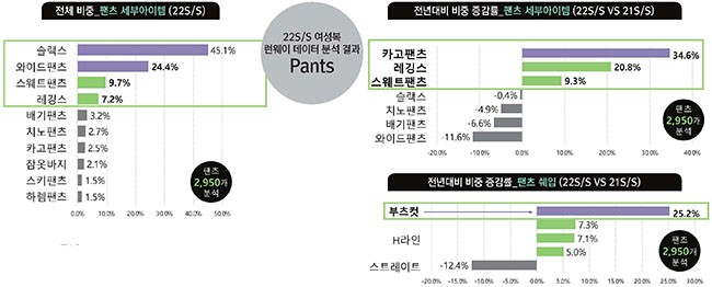 팬츠는 캐주얼 오피스룩을 위한 베이직 슬랙스와 와이드 팬츠의 점유율이 높게 나타났고, 또 여전히 편안함을 추구하는 경향이 지속되면서 레깅스와 스웨트팬츠가 전년대비 비중 증감률에서 높은 증가 수치를 나타냈다.