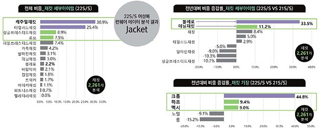 파티를 위한 스페셜 컬러와 디테일이 들어간 재킷이나, 가벼운 소재와 여유로운 핏으로 간절기 시즌 활용하기 좋은 실용적인 썸머용 재킷 등 캐주얼재킷이 30.9%로 가장 높은 점유율을 나타냈다.