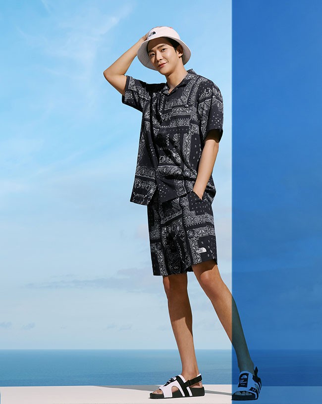 ◆‘반다나 셔츠 및 쇼츠’와 ‘코트 버켓 햇’을 착용한 ‘노스페이스’ 홍보대사 로운.