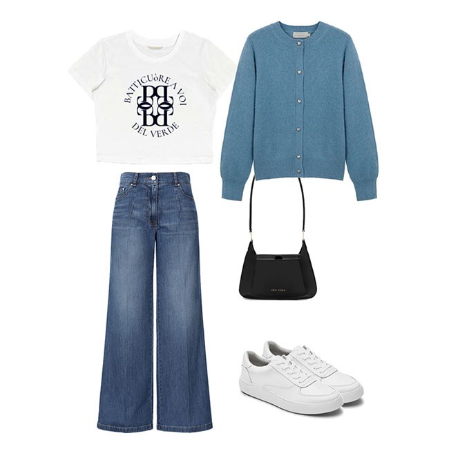 기온은 낮아졌지만 햇살은 아직 뜨거운 9월엔 가벼운 가디건을 챙겨 낮에는 어깨나 허리에 두르는 것을 추천한다. 와이드한 핏의 하이웨스트 데님 팬츠에 청량한 컬러감의 라운드 가디건을 매치하면 센스 있는 톤온톤 스타일링이 가능하다.