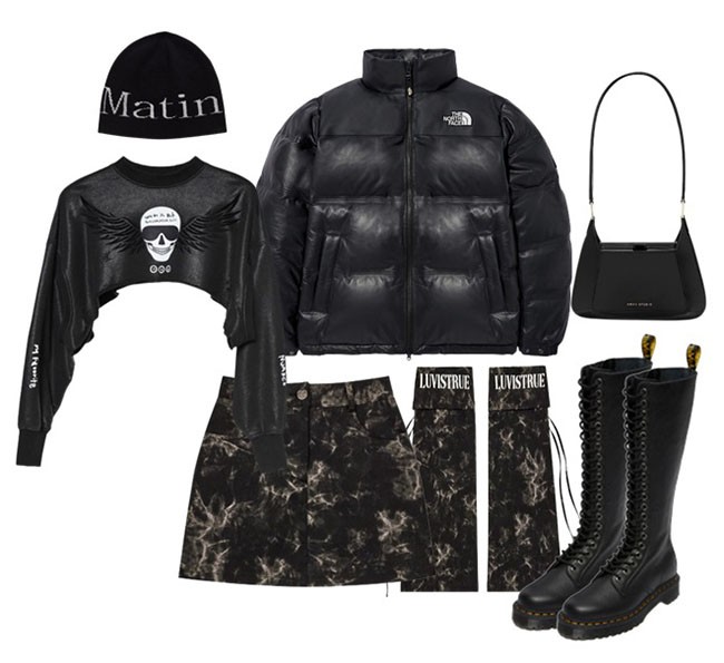 스트리트 패션을 즐기는 이들에게 겨울철 추운 날씨는 큰 고민 중 하나다. 가볍게 툭 걸치기만 해도 힙한 스타일링을 연출할 수 있는 블랙 숏 패딩을 활용해 보는 건 어떨까. 스컬 프린팅이 된 크롭 한 기장감의 맨투맨과 밀리터리 패턴의 스커트, 레그 워머를 함께 스타일링한다면 베이직한 블랙 숏 패딩을 걸치더라도 완벽한 스트리트 패션을 완성할 수 있다. 로고 플레이 비니와 베이직한 디자인의 에나멜 백, 레이스업 롱부츠를 더해 다가올 겨울에도 트렌디함을 잃지 않는 올 블랙 스트리트 룩을 제안한다.